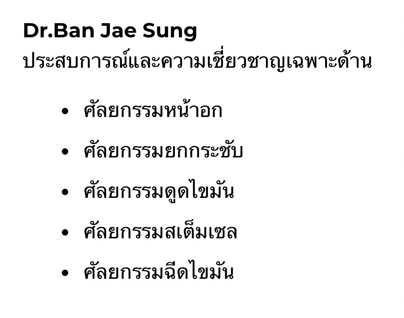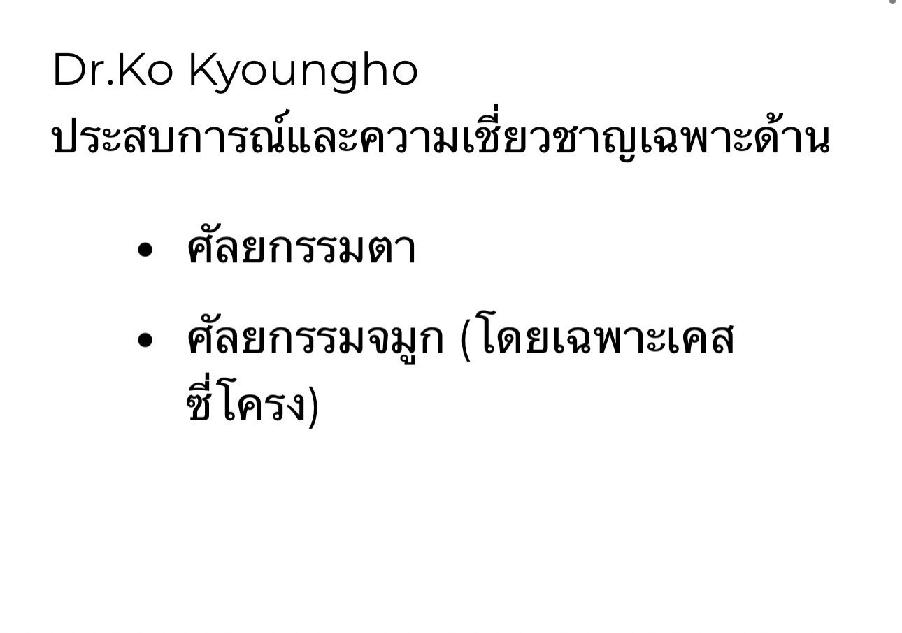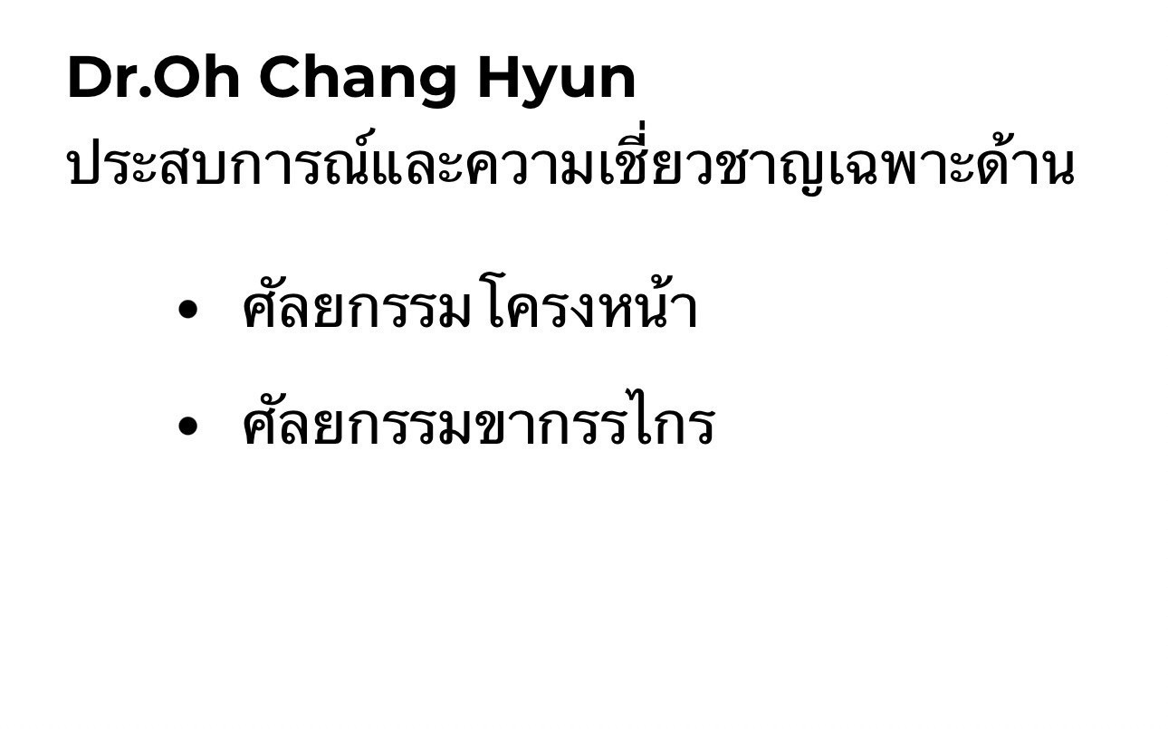 - เชี่ยวชาญ ศัลยกรรมโครงหน้า / ศัลยกรรมตา / ศัลยกรรมจมูก / ฉีดไขมัน / โบท็อกซ์ / ฟีลเลอร์