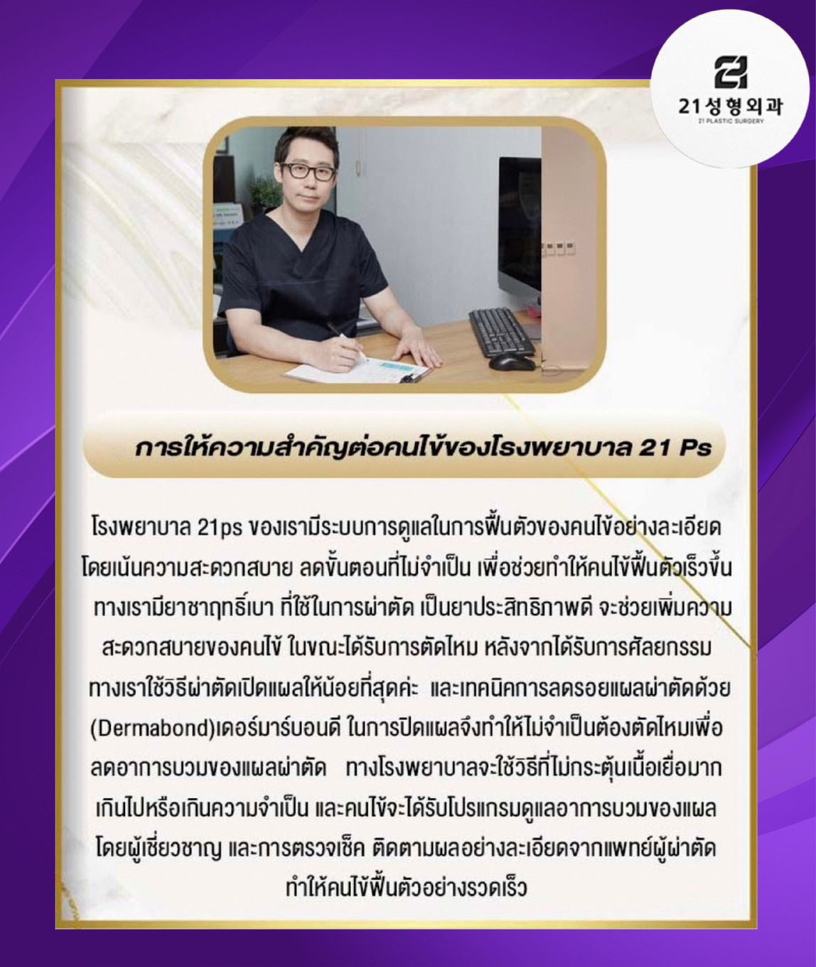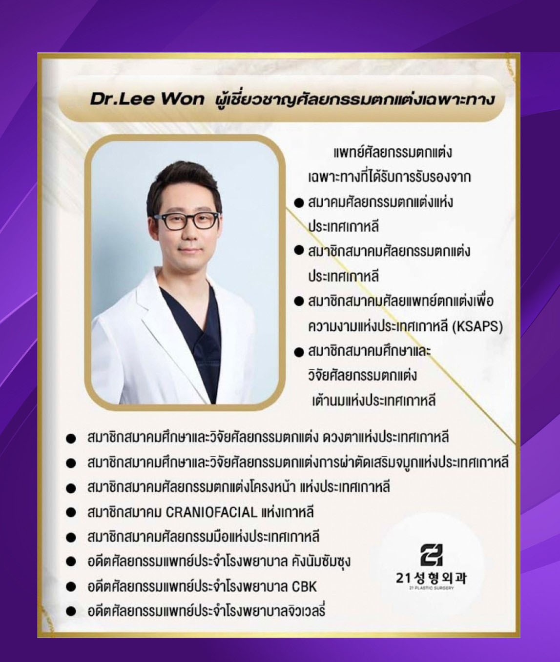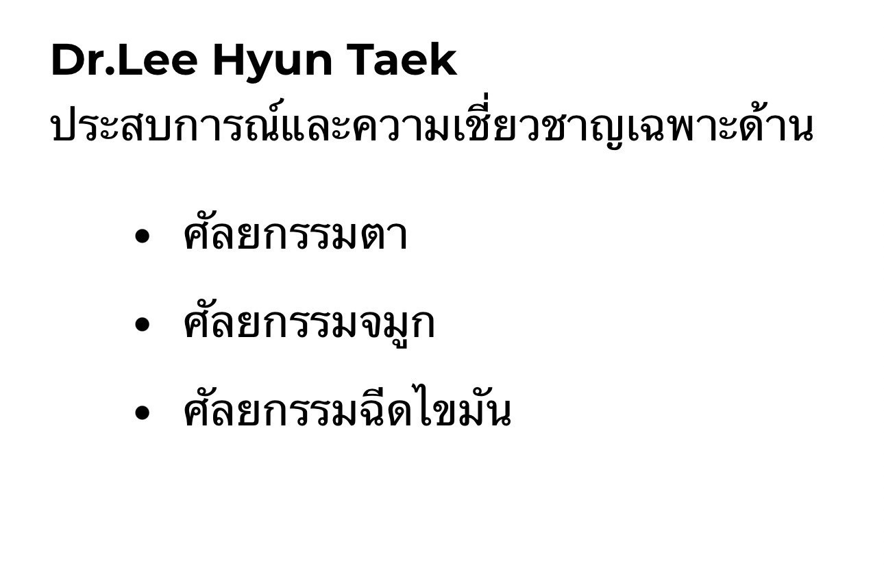 - เชี่ยวชาญ ศัลยกรรมโครงหน้า / ศัลยกรรมตา / ศัลยกรรมจมูก / ฉีดไขมัน / โบท็อกซ์ / ฟีลเลอร์