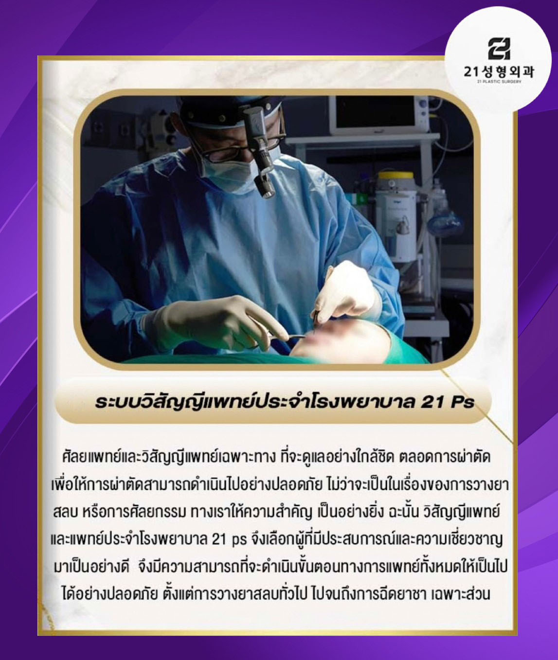 - เชี่ยวชาญ ศัลยกรรมชะลอวัย / ศัลยกรรมตา / ศัลยกรรมจมูก / ฉีดไขมัน / โบท็อกซ์ / ฟีลเลอร์