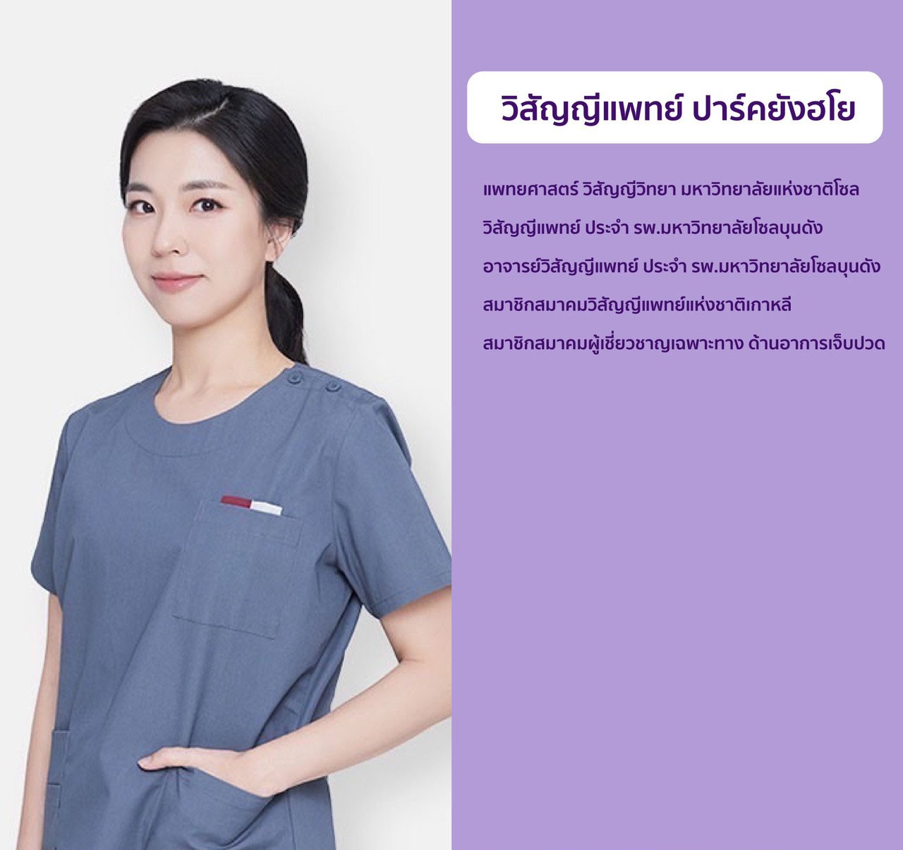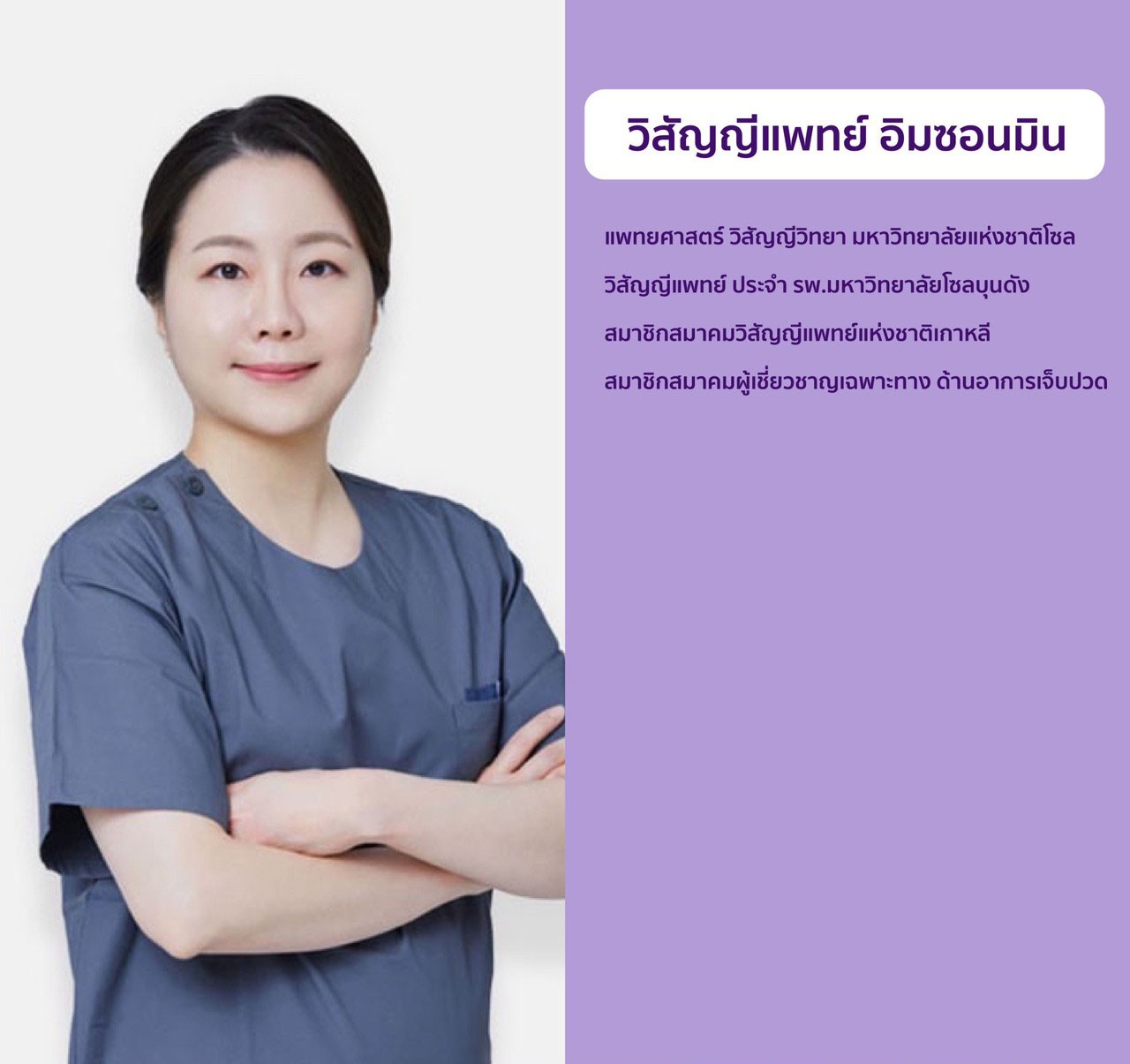 - แพทย์เฉพาะทางในภาควิชาวิสัญญีวิทยาและความเจ็บปวด มหาวิทยาลัยแห่งชาติโซล